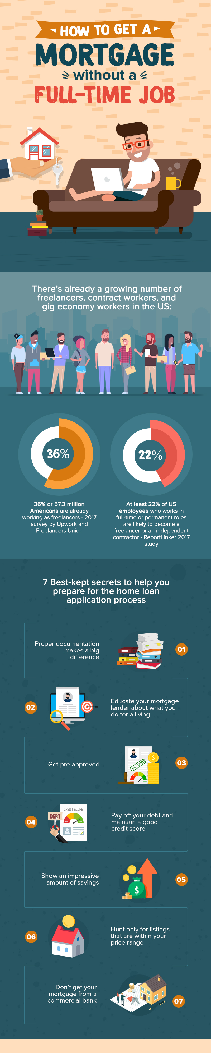 The number one advice for freelancers and gig economy workers who want to buy a home: organize all of your necessary documentation that will show a solid work history. Prepare all your records, including proof of employment and income, records of your previous work and employers, names and phone numbers of your credible references, credit union statements, tax returns, debt records, proof of assets, and other important documentation.